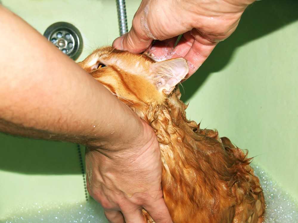 Перед погружением питомца в воду, возьмите мелкий гребень, смочите его спреем от блох и прочешите шерсть на шее, голове, за ушами и на подбородке. После, кошка погружается в соляной раствор по шею и выдерживается максимальное количество времени.