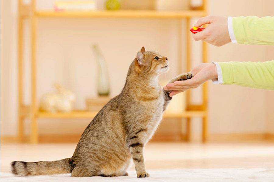 Чтобы научить кошку давать лапу, рекомендуется предварительно привлечь внимание котика кусочком еды — это усилит его аппетит и благотворно скажется на тренировке. Хозяину лучше присесть на корточки или колени, чтобы находиться лицом к лицу с питомцем