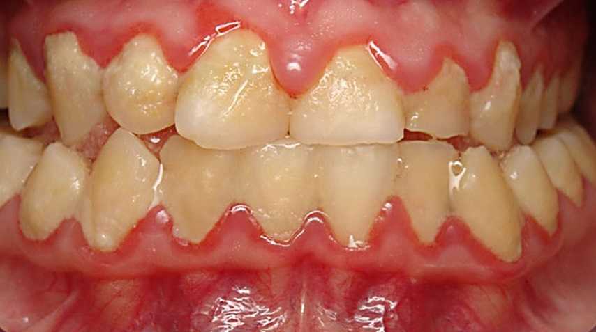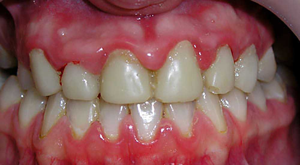 Разрастание тканей десны, увеличение межзубных сосочков, десна ярко-красного цвета, синюшная, имеет нездоровый блеск. При осмотре отмечается кровотечение из увеличенных в объеме десен. Между зубами и деснами можно увидеть углубления, напоминающие патологические зубодесневые карманы, в них часто выявляются остатки пищи.![]() |