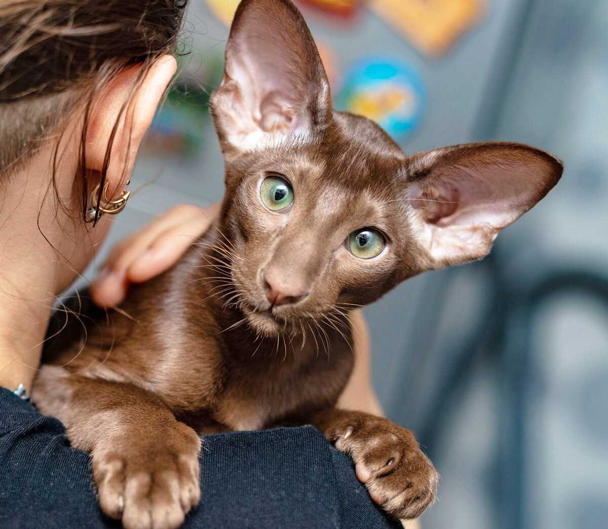 - Ориентальная кошка. Существует 2 разновидности этой породы: короткошерстная и длинношерстная. Шерсть не имеет подшерстка и плотно прилегает к телу. Животное отличается необычным внешним видом – вытянутой мордой, большими ушами и длинными конечностями, а также добрым и общительным характером. Они остаются активными до самой старости и любят играть с членами семьи, что делает их похожими на собак.