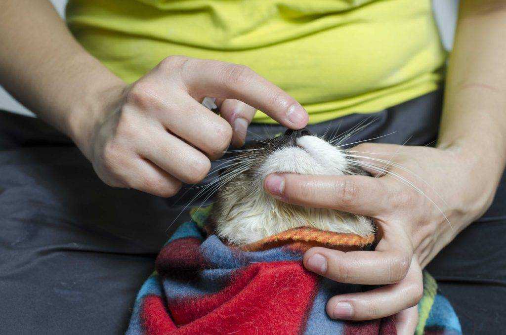 - Возьмите кота на руки и свободной рукой аккуратно раздвиньте ему челюсти (если животное сильно сопротивляется или дерётся, следует замотать его в полотенце или одеяло).