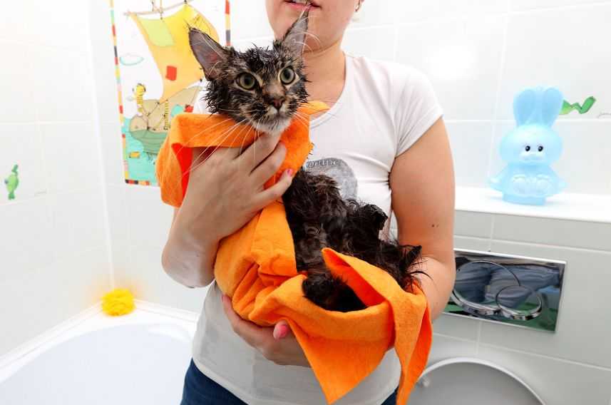 Поэтому перед тем, как вытаскивать кошку, можно немного отжать шерсть. Завернуть кошку в полотенце и промокнуть шерсть. Затем взять второе сухое полотенце и завернуть кошку
