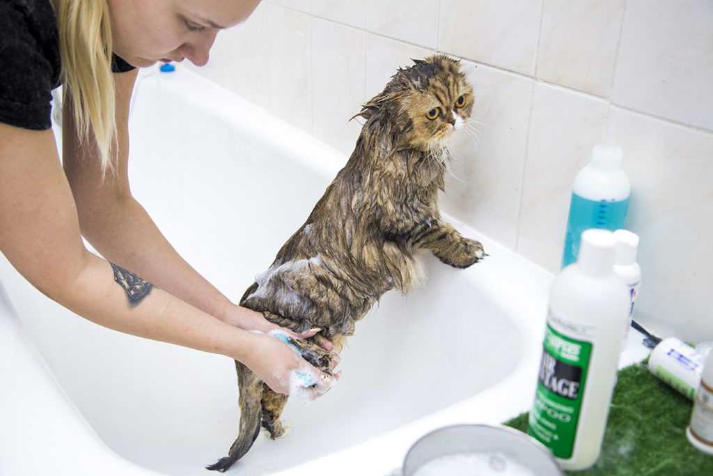 Когда шкурка животного достаточно смочена, наносится небольшая порция шампуня, при этом кошка удерживается за передние лапки
