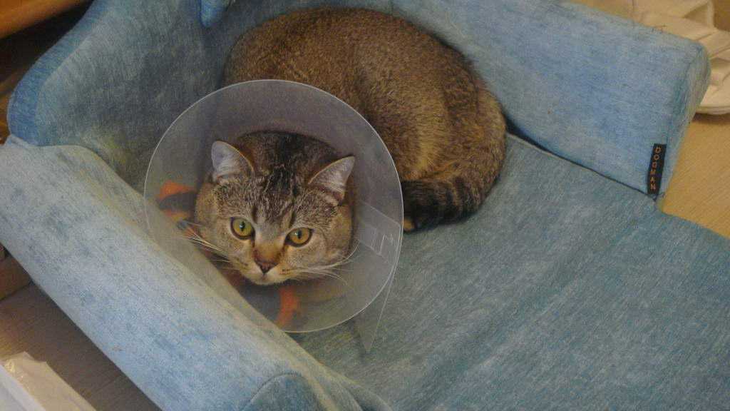 Чтобы защитить прооперированную область от шершавого кошачьего языка (при заживлении швы чешутся и кот будет стремиться их разлизать), нужно надеть на кота специальный пластиковый воротник. Носить этот ворот питомец будет до того момента, пока не снимут шовный материал – обычно это происходит в течение десяти дней после операции.