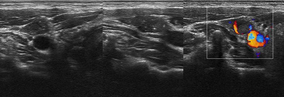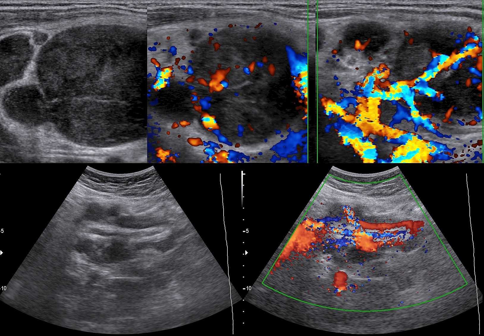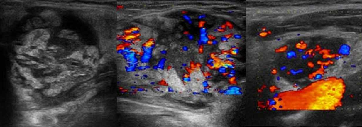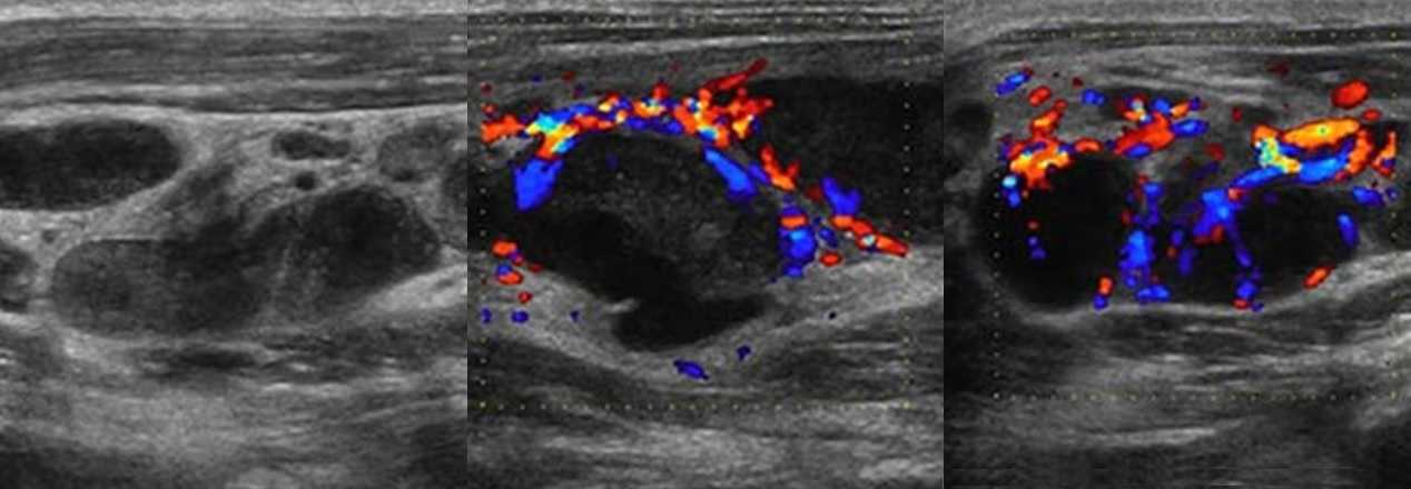 Рисунок. Женщина 32-х лет с «опухолью» на шее. На УЗИ в левой надключичной области определяются один большой и несколько маленьких гипоэхогенных лимфоузлов, округлой формы, центральный гиперэхогенный рубчик тонкий; кровоток заметно усилен, сосуды расположены хаотично, диаметр не уменьшается по направлению к капсуле, выраженный подкапсульный кровоток. В левой подвздошной ямке видно «сэндвич» — конгломерат из увеличенных гипоэхогенных лимфоузлов, между которыми залегают сосуды брыжейки. Заключение: Лимфоаденопатия с эхо-признаками злокачественного процесса. Рекомендована биопсия измененных лимфоузлов.
