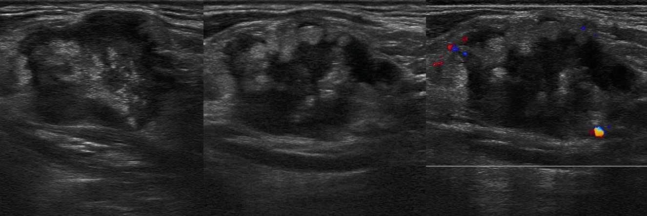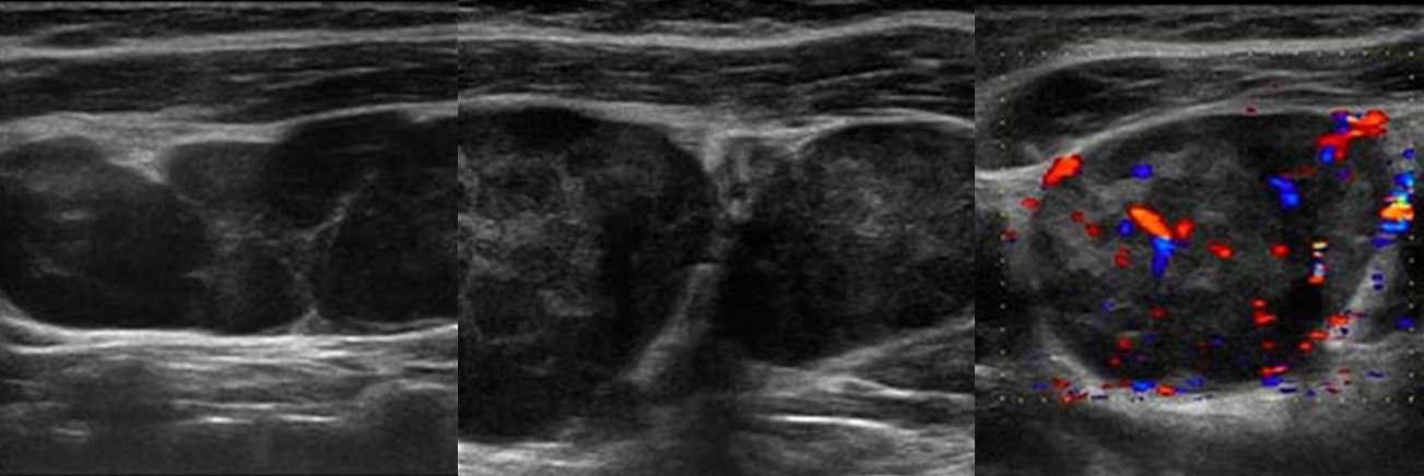 Рисунок. Мужчина 63-х лет обнаружил «опухоль» на шее: растет медленно без боли и лихорадки. На УЗИ в районе кивательной мышцы определяется группа резко гипоэхогенных лимфоузлов без центрального рубчика, размер 10-20 мм; часть лимфоузлов округлые; встречаются лимфоузлы с резко усиленным кровотоком. Заключение по результатам биопсии: Лимфома.