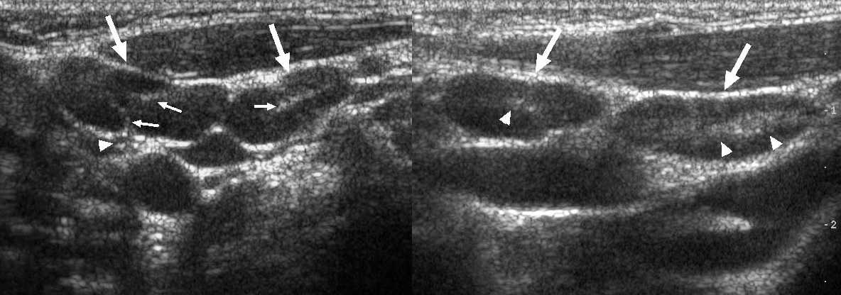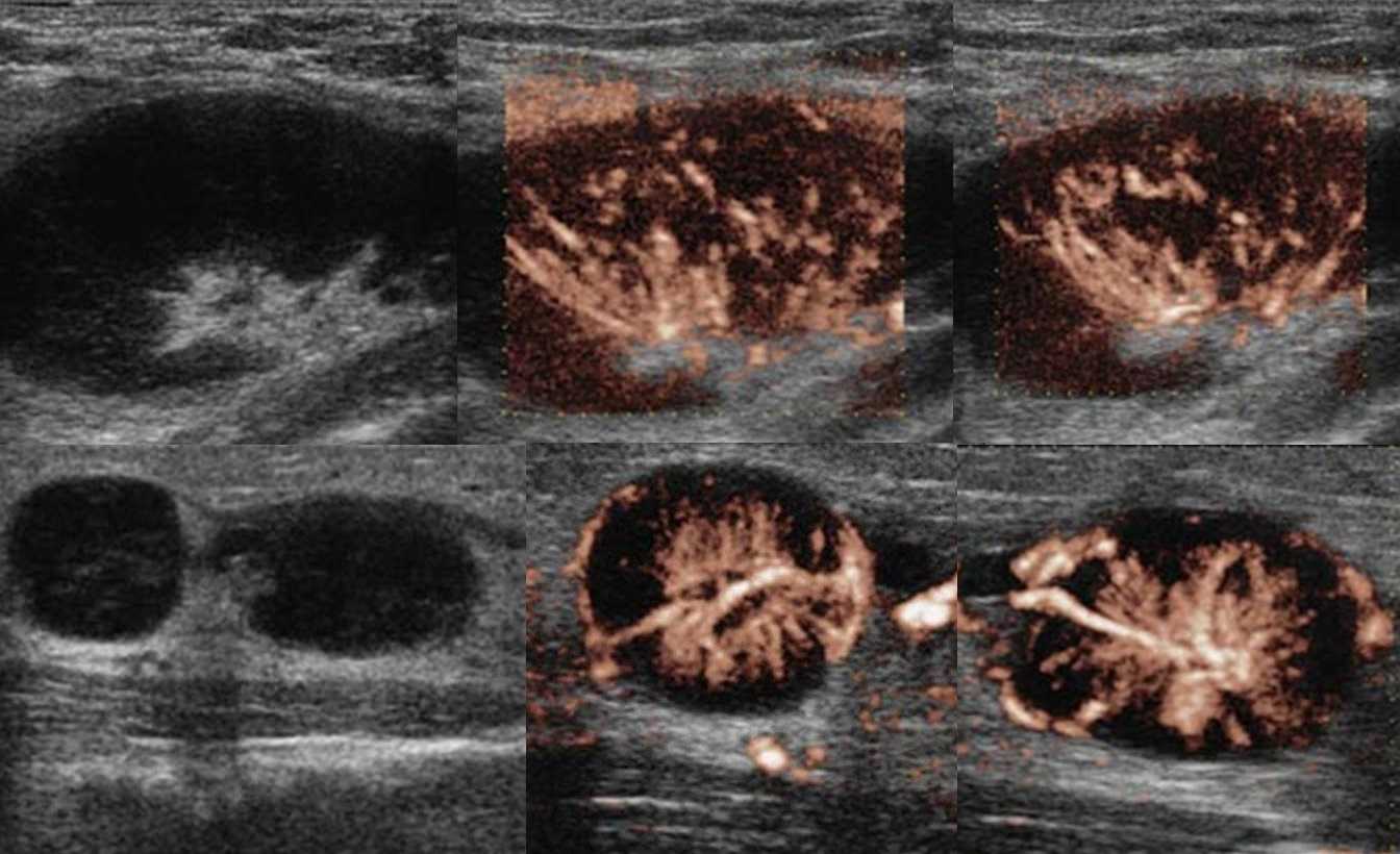 Рисунок. Женщина жалуется на «опухоль» в подмышке и на локте. Неделю назад повздорила с соседской кошкой. На УЗИ подмышечный (сверху) и локтевые (снизу) лимфоузлы увеличены, округлой формы, выраженная гиперплазия корковой и околокорковой зоны, гиперэхогенный центральный рубчик сохранен; кровоток заметно усилен, сосуды расположены правильно — радиально. Заключение: Лимфаденопатия с признаками высокой степени активности. При болезни кошачьей царапины на месте укуса или царапины образуются небольшие гнойнички и одновременно воспаляются близкие лимфоузлы. Один или группа лимфоузлов увеличиваются в размерах до 5-10 см, становятся болезненными, уплотняются. Через 2-4 недели происходит самоизлечение. Иногда образуются абсцессы и свищи.