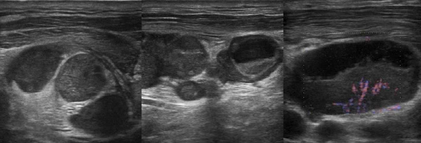 Задача. У ребенка на шее множественные умеренно округлые л/у до 1*0.8 см, в центре одного лимфоузла округлый анэхогенный очаг до 0.3 см, чуть выше л/у пятнистые (нечёткие разряженые участки). Часто смотрю лимфоузлы, такие вижу впервые. Помогите сориентироваться, что это может быть? Ответ: Интересное фото — картина ненормальная. Похоже на локальную инфильтрацию клеточными элементами — как варианты, лимфоциты кругом инфекционного агента (например, туберкулез и др.), метастазы и т.д. Рекомендовано: УЗИ всех групп л/у с акцентом на надключичные, что встречаются только в патологических случаях — например, лимфома Ходжкина; оценить пробу Манту; рентген или КТ грудной клетки по показаниям. При неспособности решить задачу наблюдение 1 раз в месяц.