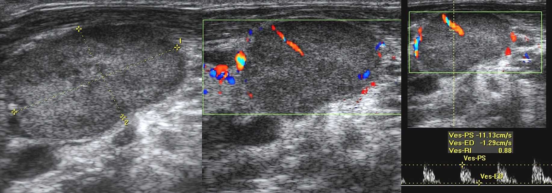 Рисунок. На УЗИ лимфоаденопатия с эхо-признаками злокачественного процесса: увеличенный (28х16 мм) лимфоузел, округлой формы (Д/К <2), гипоэхогенный без центрального рубчика; определяется подкапсульный кровоток, диаметр сосудов не уменьшается по направлению к капсуле, RI 0,88.