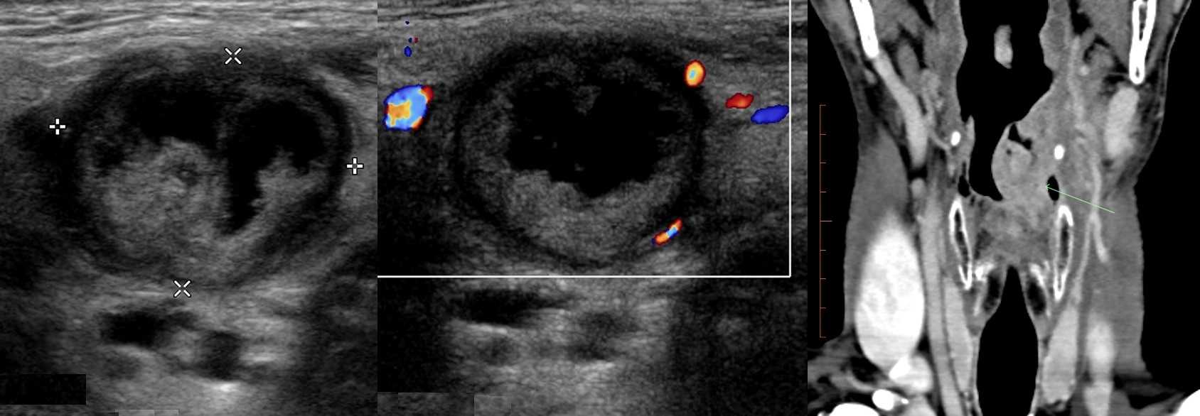 Рисунок. Мужчина 50-ти лет с жалобами на осиплость голоса, «опухоль» на шее слева. На УЗИ на шее определяется круглое образование с большой анэхогенной полостью в центре — зона некроза. На КТ видно большую опухоль в надгортанной области слева. Заключение по результатам биопсии: Увеличенный лимфоузел с метастазами плоскоклеточного рака. Для плоскоклеточного рака типичен центральный некроз лимфоузлов.