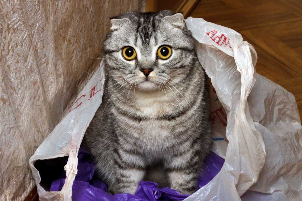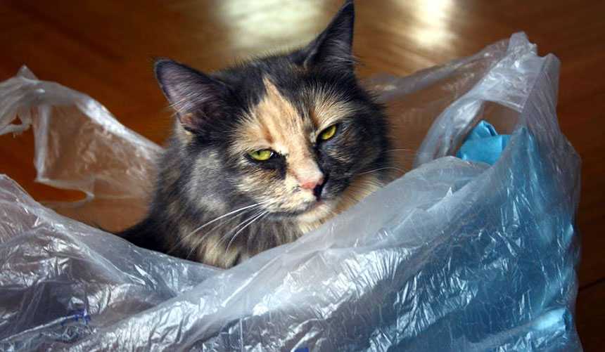 Нередко после возвращения домой можно обнаружить, что кот разорвал пакет и кусочками полиэтилена усеян весь дом, а «виновник торжества» сидит довольный посреди этого беспорядка. Такая история может повторяться и с упаковочной пленкой, и даже с подарочными пакетами.