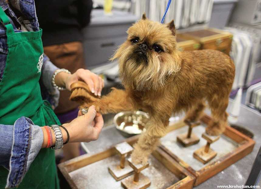 Для профилактики зубных болезней грифона чистите их щеткой или протирайте кусочком марли. По мере необходимости чистите уши и как минимум раз в месяц подстригайте когти. Многие грифоны любят все в процедуре груминга, кроме обрезания когтей. Целая комната грифонов исчезает за один миг, когда вы откроете ящик и достанете когтерезку. Чтобы излишне не травмировать малыша — почитайте нашу недавнюю статью: как стричь собаке когти.