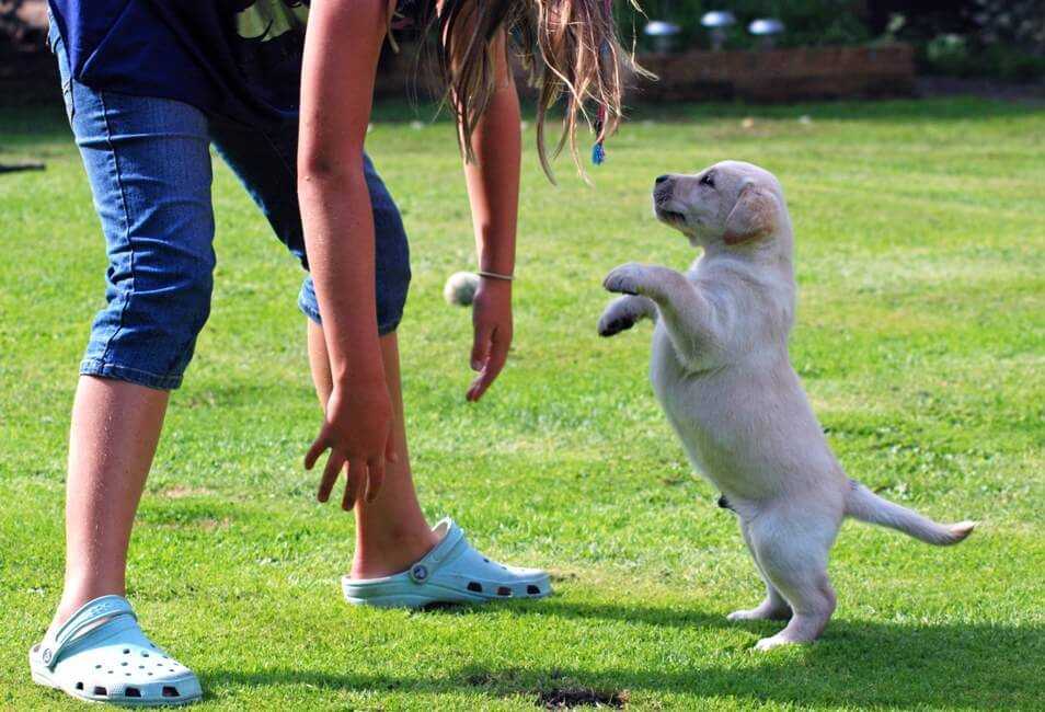 Маленьких щенков лучше обучать во время игры. В процессе встречи можно закрепить правила хорошего поведения у питомца. Как только хозяин входит в дом, песик спешит на встречу. В данном случае нужно наклониться к нему, чтобы у него не было искушения запрыгнуть.