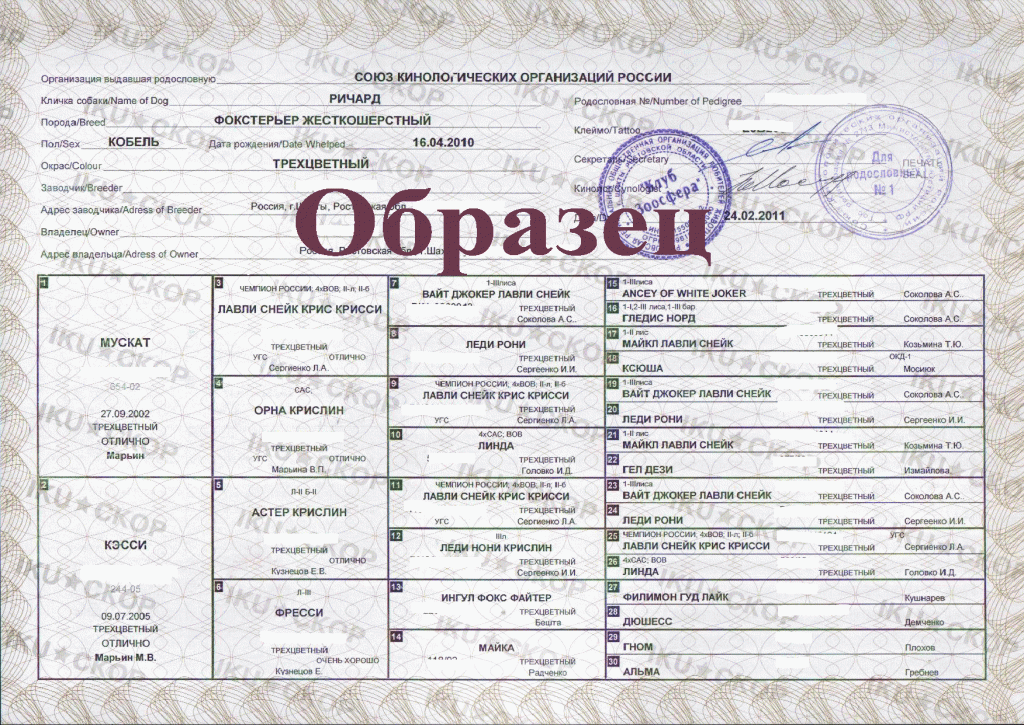- Свидетельство о происхождении единого образца. Содержит регистрационный номер, указание породы, клички, даты рождения, окраса и пола. Обязателен буквенный код и номер поставленного клейма. Также вносятся информация про заводчика и владельца. Далее следуют сведения о трех коленах предков собаки. Этот вариант позволяет участвовать в выставках и вязках, завоевывать интернациональные и национальные титулы. При продаже собаки иностранцу, проставляется штамп “Export” на образец. Заполняется на русском и английском языках.