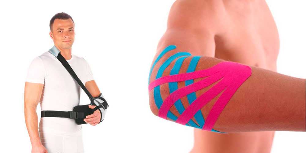 - наложение фиксирующей повязки или ортеза, подойдет также тейпирование – фиксация локтя при помощи липких лент;