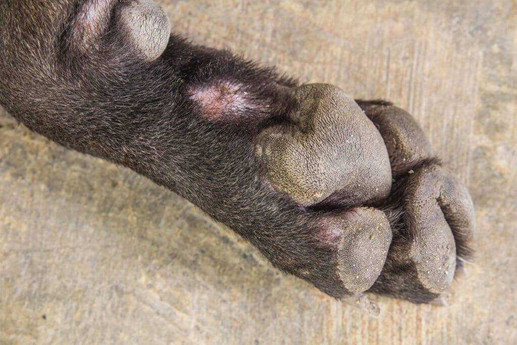 Воспалительный процесс затрагивает места на лапах, которые больше контактируют с землей (снегом, асфальтом) – подушечки. На них и между пальцами появляются краснее пятна, которые постепенно разрастаются вширь, захватывая участки здоровой кожи.